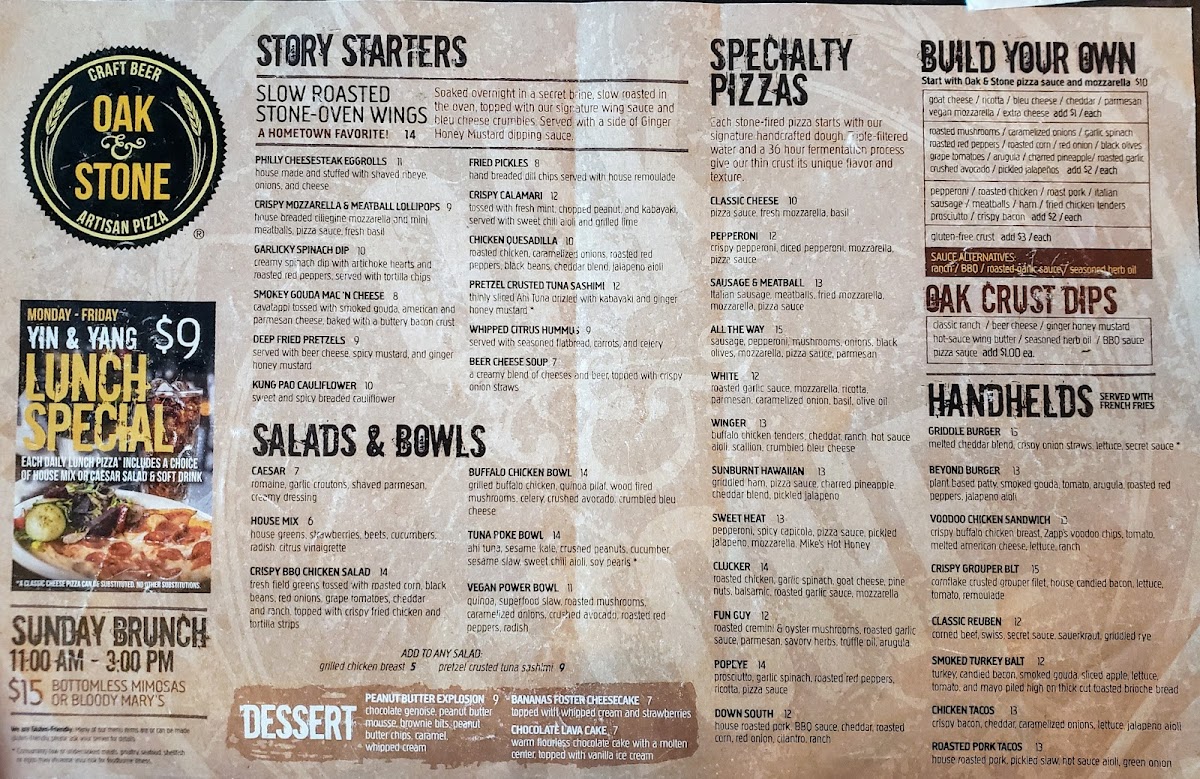 “ We visit Siesta Key & Sarasota 3-4 times a year. On this trip we've been to Oak & Stone 3 times in 10 days. Each time we've been lucky enough to have Chelsea as our server. She's been great! Patient, friendly and happily took me step by step through signing up on their app since I'm not the best with technology. Definitely will request to be seated in her section on future visits. Now, ref the Beer Wall,it's a little overwhelming at first. But not to fear, Robert asked the right questions. He then suggested a few beers for a taste before deciding. Very helpful so you don't waste money on a drink you don't enjoy. He even remembered us from our visit last week. Some beers had rotated out so he had new suggestions...again, spot on! Love the pizza....nice thin and crisp crust just like we like it! Chelsea & Robert added to our pleasant experience........oh, I forgot to mention the chocolate bourbon cake and the peanut butter cheesecake... yummy ”